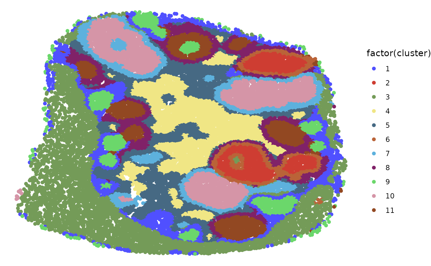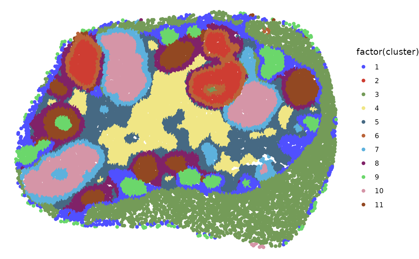ggplot2::ggplot(ggplot2::aes(x, y, color=factor(cluster))) +